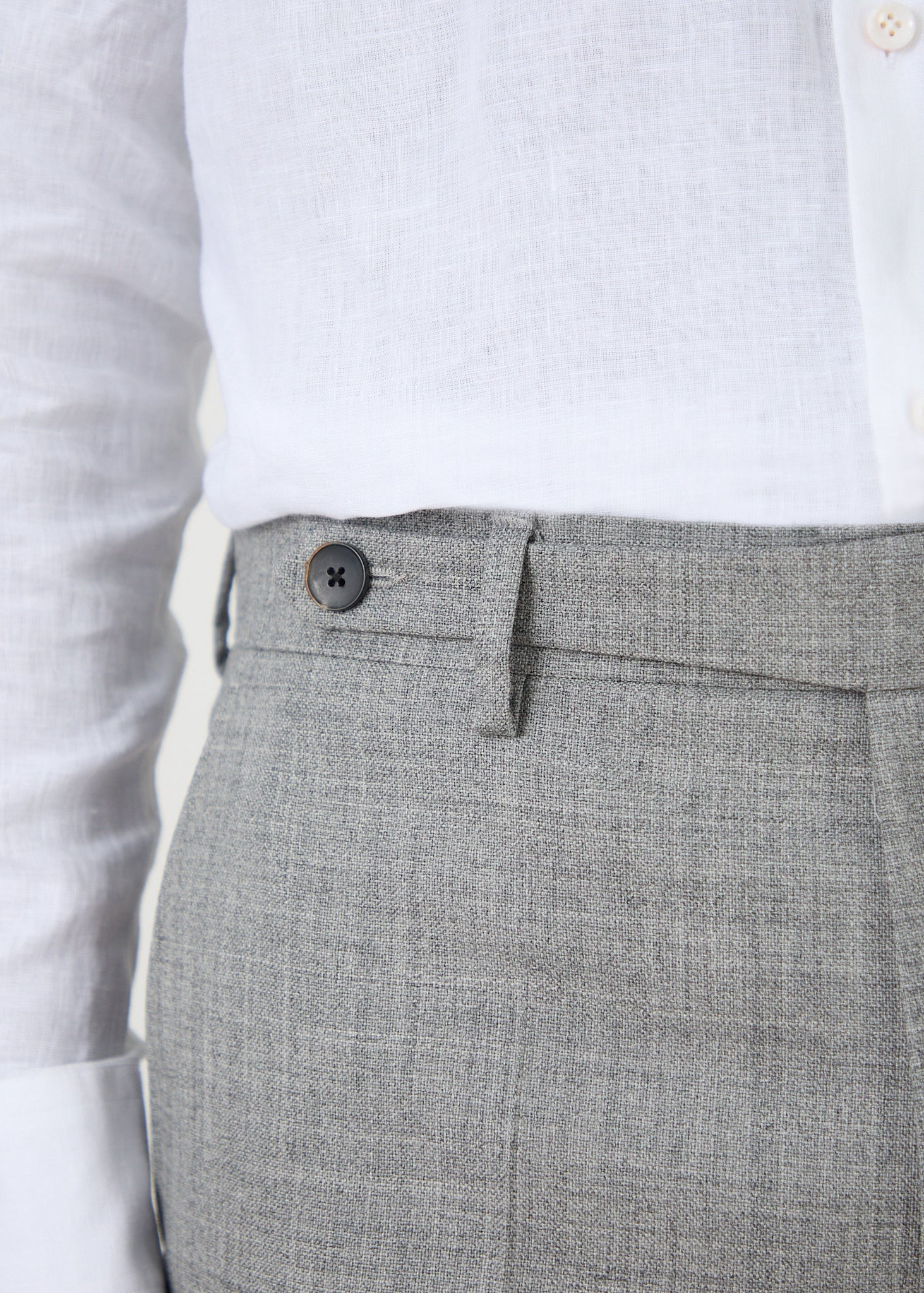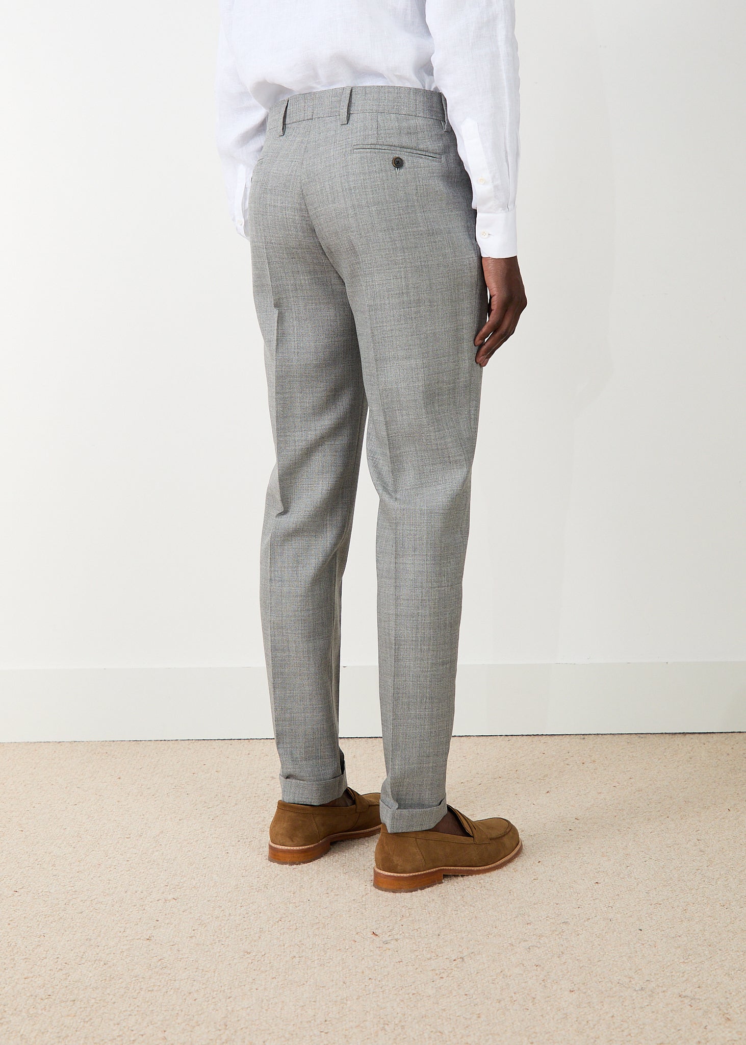 La différence entre un pantalon et un beau pantalon réside dans l’allure qu’il vous donne. C’est le tombé du tissu qui soutient cette allure et avec celui-ci, vous êtes entre de très bonnes mains. Son équilibre entre tenue et fluidité offre une allure impeccable à son porteur. Mais notre cœur bat surtout pour son grain unique et son toucher sec, qui le distinguent tout en apportant un charme rustique qui rappelle certains costumes vintage. C’est la main caractéristique de la laine des moutons Shetland, originaires des îles du même nom en Écosse.