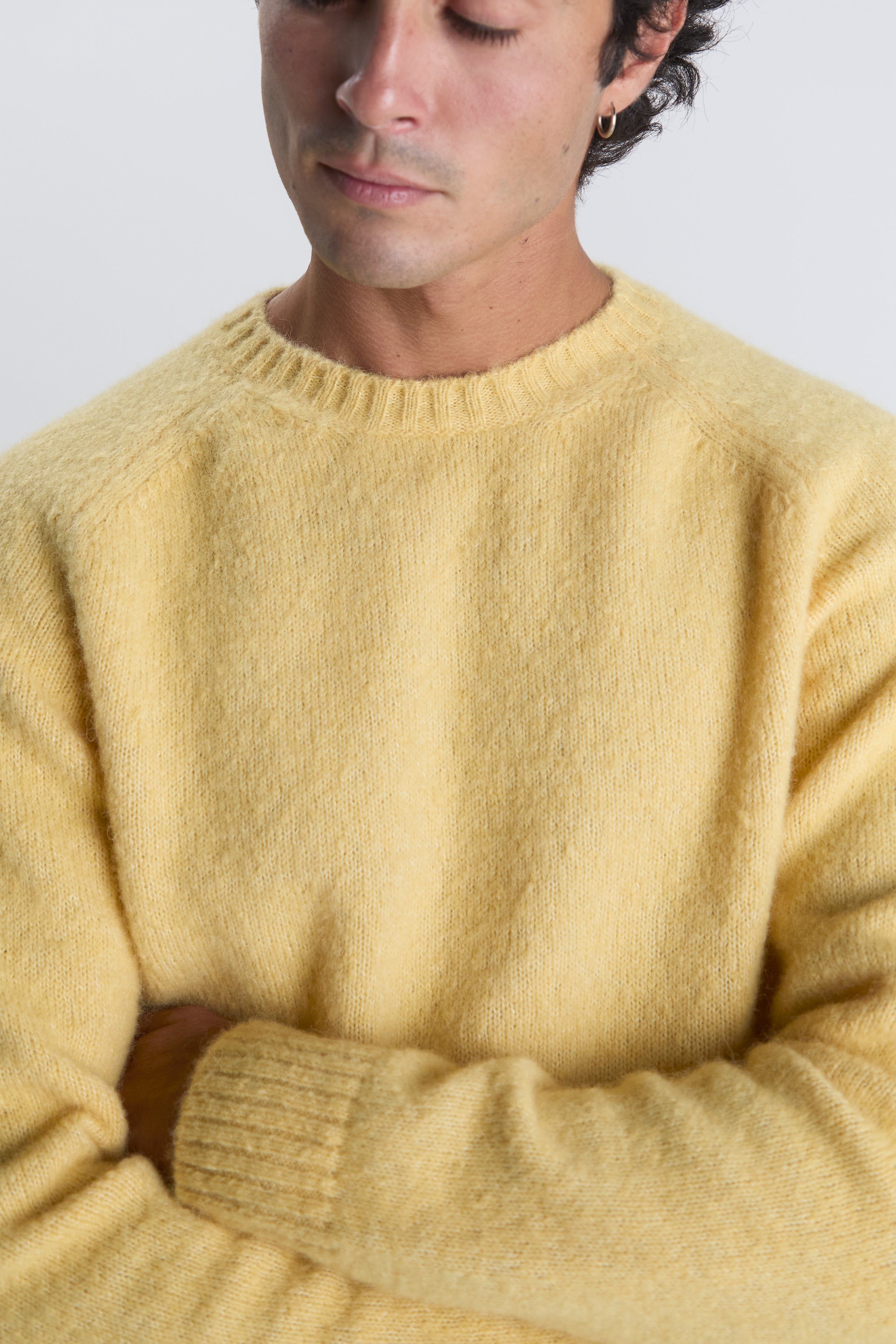 Mais c’est au tricoteur italien Visconti que nous devons la touche finale : un brossage sur une machine vintage qui soulève et tire délicatement les fibres, après un lavage qui stabilise la maille et l’assouplit, pour obtenir l’effet shaggy le plus doux qu’on ait pu toucher.
