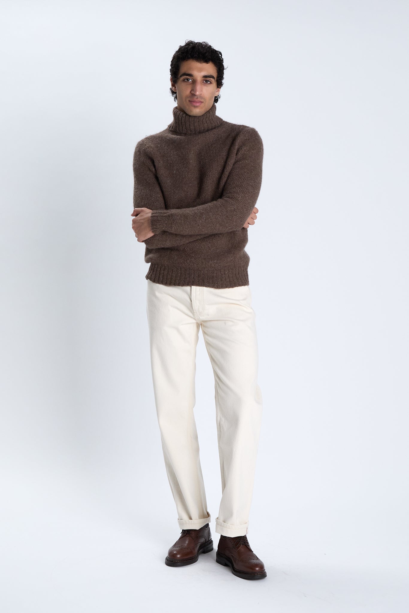 Et c’est au tricoteur italien Visconti que nous devons la touche finale : un brossage sur une machine vintage qui soulève et tire délicatement les fibres, après un lavage qui stabilise la maille et l’assouplit, pour obtenir l’effet shaggy le plus doux qu’on ait pu toucher.